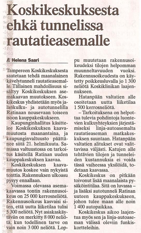 Jatketaan kauppakeskusteemalla. Koskikeskuksesta suunnitellaan tunnelia rautatieasemalle. Ja kun tunneli tulisi myös uuteen Ratinan kauppakeskukseen ja linja-autoasemalle, päästäisiin lähelle yhtä fiksua järjestelmää Helsingin keskustan kanssa. Kohta sadekeleillä ei juurikaan tarvitse käydä ulkona, kun Tullin alueelta pääsee aina Ratinaan saakka :D