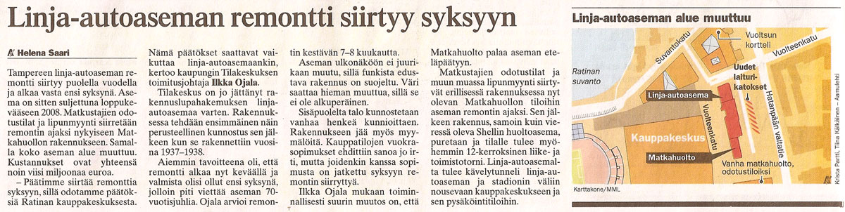 Aamulehdessä kerrottiin Tampereen linja-autoaseman remontista. Remontin piti alkaa jo keväällä, mutta se siirtyy syksyyn. Syynä on Ratinan kauppakeskus ja sen päätösten pitkittyminen. Tässä jutussa vihjailtiin myös 12 kerroksisesta liike- ja toimistotornista, joka rakennettaneen samalle tontille :)